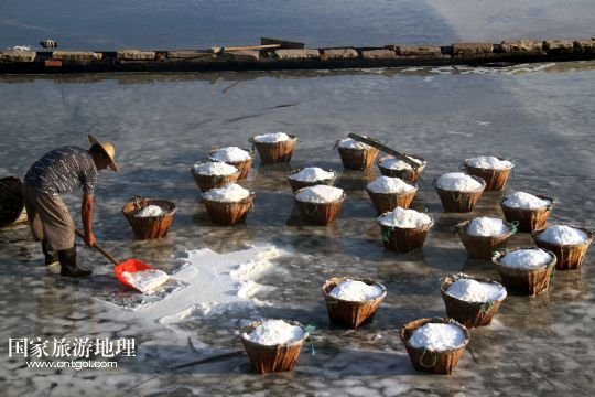 國(guó)家旅游地理 浙江臺(tái)州8月10日訊 8月10日,在浙江溫嶺市石塘鎮(zhèn)蒼岙鹽場(chǎng),一名鹽工頂著太陽(yáng)在鹽田里把曬好的鹽收集起來(lái)挑到鹽堆去。連日來(lái),浙江省溫嶺市石塘鎮(zhèn)蒼岙鹽場(chǎng)的鹽工利用晴熱天氣忙著曬鹽。對(duì)于浙江的曬鹽人來(lái)說(shuō),夏季陽(yáng)光最猛烈的7月、8月、9月這三個(gè)月是他們勞作的黃金季節(jié)。天氣越炎熱,光照越猛烈,曬鹽效果就越好。炎熱的夏天艷陽(yáng)高照,而曬鹽人卻要頂著高溫出門(mén)勞作。 /新華社發(fā)(梁敏慧 攝)