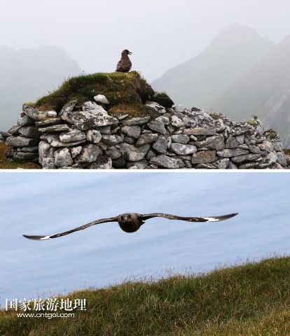 上圖,一只大賊鷗把當(dāng)年村民的儲(chǔ)物石屋當(dāng)作了自己的巢穴(7月19日攝)。圣基爾達(dá)島上散布著數(shù)百個(gè)石頭壘砌,草皮作頂?shù)膬?chǔ)物石屋,用來保存村民獵取的鳥類和用途燃料的泥炭。下圖,一只大賊鷗直飛過來,襲擊靠近它的巢穴的記者(7月19日攝)。