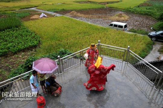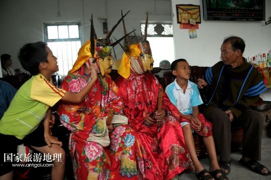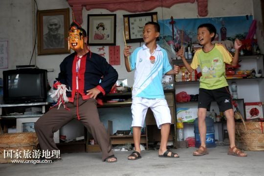 國家旅游地理 廣西河池8月19日訊 8月18日,譚圣慈老人(左一)帶著前來學習的兩名男孩跳儺面舞。在廣西北部與貴州交界一帶的我國唯一的毛南族自治縣——環(huán)江毛南族自治縣,神秘的儺戲被譽為毛南族的“族寶”。原始古樸、風格獨特的儺戲是毛南族的民間傳統(tǒng)舞蹈,藝人在表演過程中經(jīng)常戴著被稱為儺面的木制面具。儺面一般高30厘米、寬20厘米,由毛南族藝人在民族口頭文學的基礎(chǔ)上依據(jù)個人想象創(chuàng)作,用優(yōu)質(zhì)木塊雕琢而成,共有文、武、善、兇四大類72種面相。
