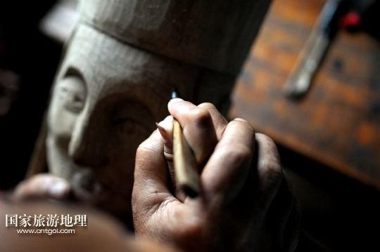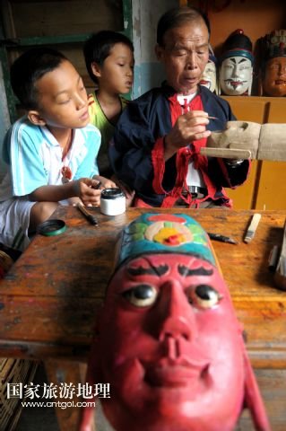 譚圣慈老人今年72歲,從22歲開始學雕刻儺戲面具,迄今,已經(jīng)堅持了50年。老人說,他制作的面具因工藝精湛,造型優(yōu)美,曾吸引遠方的客人高價購買。但是,卻少有人來學習面具的雕刻與制作。儺戲于2006年被列入非物質(zhì)文化遺產(chǎn)名錄之后,政府加大了保護力度,但因為面具的制作周期長、工序復(fù)雜,銷售渠道少等原因,仍無法吸引年輕人學習雕刻的興趣。為了收到心儀的徒弟,傳承這獨到的技藝,他到處發(fā)布免費收學徒的信息。在他的堅持下,今年暑期,鄉(xiāng)里有兩名對面具制作感興趣的男孩來到譚圣慈身邊學藝。老人高興地說:“我給他們講很多故事,就是希望他們能對此提起興趣,愛上木面雕刻,別讓這老手藝失傳了。” /新華社發(fā)