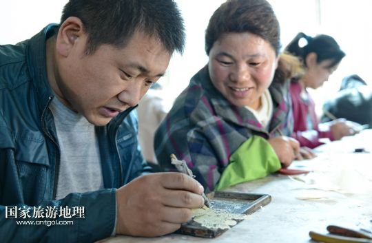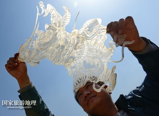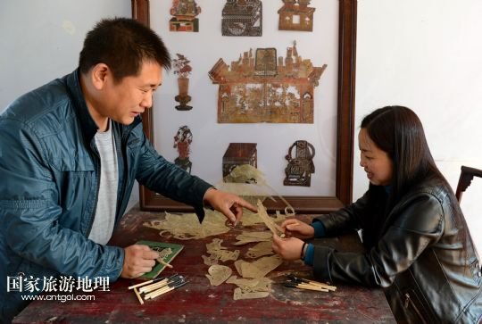 國(guó)家旅游地理 河北唐山4月2日訊 郭寶在檢查一件皮影藝術(shù)品的雕刻質(zhì)量(3月30日攝)。河北省遷安市趙店子鎮(zhèn)馬古寺村村民郭寶自幼喜歡皮影雕刻,師承當(dāng)?shù)氐窨趟嚾送跽淅舷壬?,他雕刻的影人造型古樸、工藝精?xì),深受皮影收藏愛好者的歡迎。2003年,郭寶成立了“郭寶皮影傳承工作室”,并從村里招來(lái)20多位喜歡皮影藝術(shù)的農(nóng)民專門從事皮影雕刻。經(jīng)過(guò)幾年的發(fā)展,如今郭寶皮影工作室開發(fā)設(shè)計(jì)皮影工藝品3000余種,在傳承保護(hù)唐山皮影的同時(shí)還獲得了豐厚的收入。 /新華社記者楊世堯攝