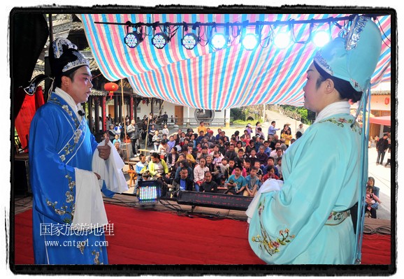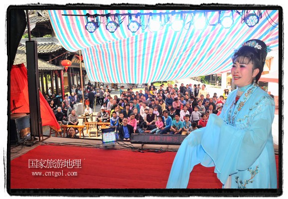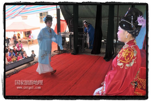 江西省婺源縣賦春鎮(zhèn)源頭村景區(qū)邀請(qǐng)了安徽黃梅戲劇團(tuán)在村門(mén)口為村民表演輪翻上演黃梅戲】