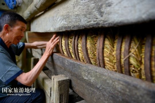 國家旅游地理 湖北恩施6月23日訊 6月21日,在湖北省宣恩縣箭竹坪村的榨油房里,“打榨佬”們揮舞撞錘猛擊楔子。紀(jì)錄片《舌尖上的中國》第二季熱播,讓片子中出現(xiàn)的手工榨油技藝進(jìn)入公眾的視野。在湖北西部山區(qū)恩施土家族苗族自治州宣恩縣李家河鄉(xiāng)箭竹坪村,依然留存有手工榨油的榨房及一批身懷絕技的手藝人。