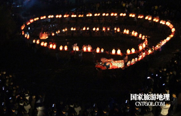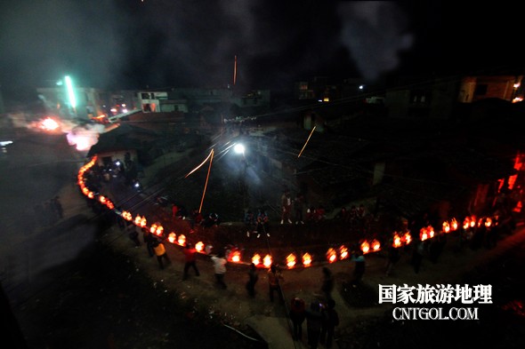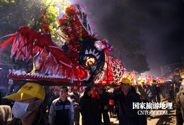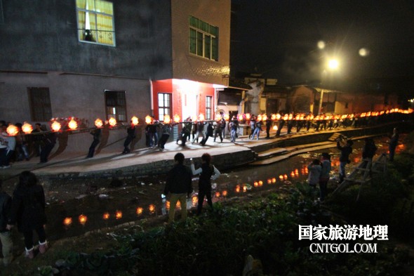 2月18日入夜,春雨霏霏。在光裕堂祖祠祭龍頭畢,鄒姓村民紛紛肩抬慶燈到祖祠接成220多米長(zhǎng)的“龍”身。三聲銃響,游龍時(shí)而在村間慢悠游弋,時(shí)而在村道滯拔狂走,火紅的燭光伴著霏霏春雨,讓慶燈“龍”絢麗多姿,展示了“紙包火”的奇跡。 游“龍”所經(jīng)之處,鞭炮和禮花聲不絕于耳,祈求五谷豐登、吉祥如意。街巷人山人海,熱鬧非凡,一派花燈游龍慶豐收狂歡鬧元宵盛況。 吸引了海內(nèi)外游客及四鄰八鄉(xiāng)的萬(wàn)余群眾紛紛前往觀看。